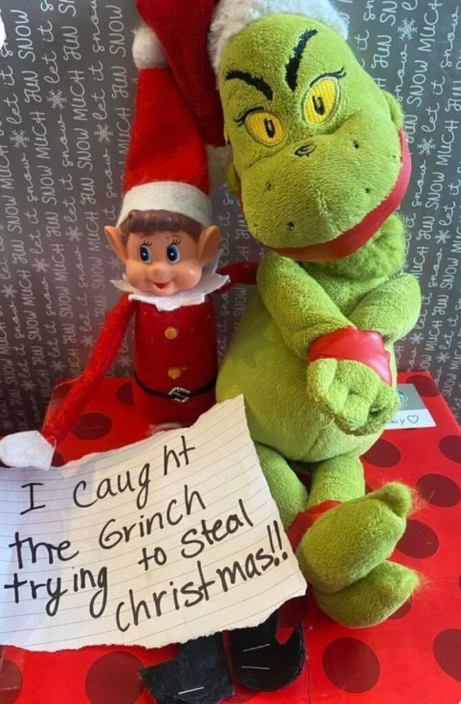 Tie up a small Grinch toy with ribbon or string and sit your elf proudly beside it, holding the other end like they’ve just saved Christmas.