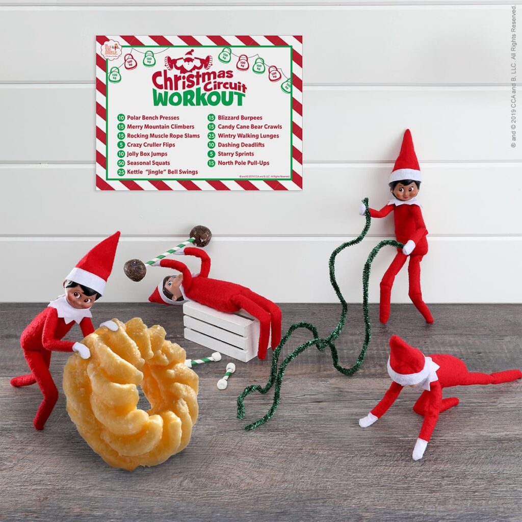 Pose your elf lifting a candy cane like a dumbbell or doing pushups on Lego blocks.
