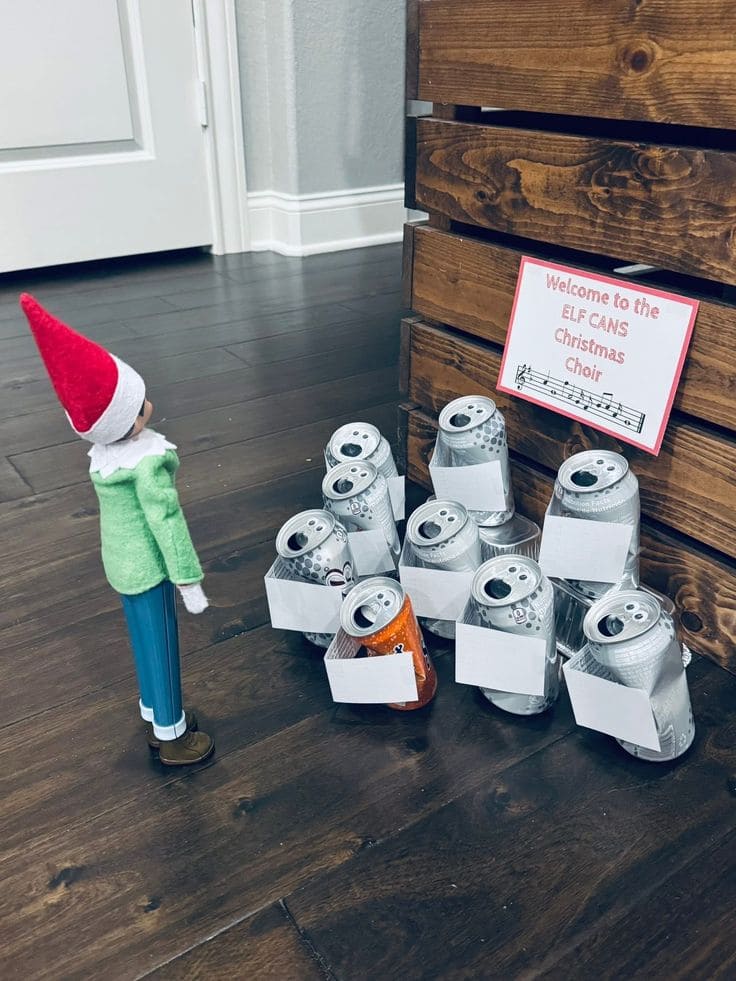 Line up a few canned goods from your pantry like they’re in a choir, and place your elf in front holding a tiny “songbook.”