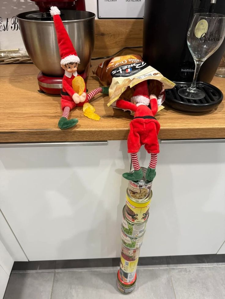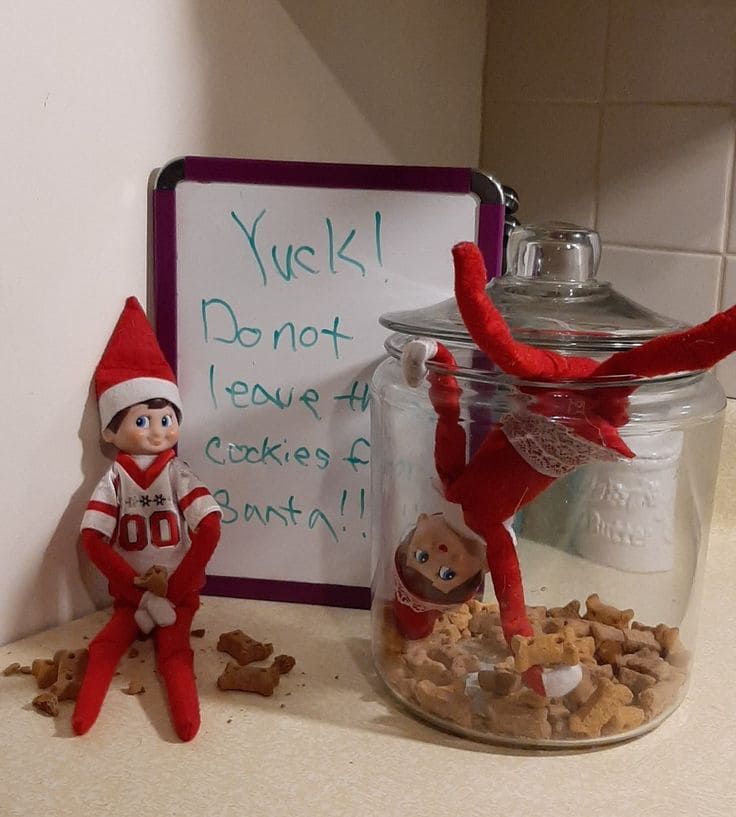 Stick your elf halfway into a cookie jar with only their legs poking out. You can add a note that says “Worth it.”