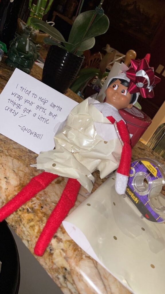 Wrap a few random household objects, like a banana, a shoe or itself in wrapping paper and put your elf in the middle holding the tape.