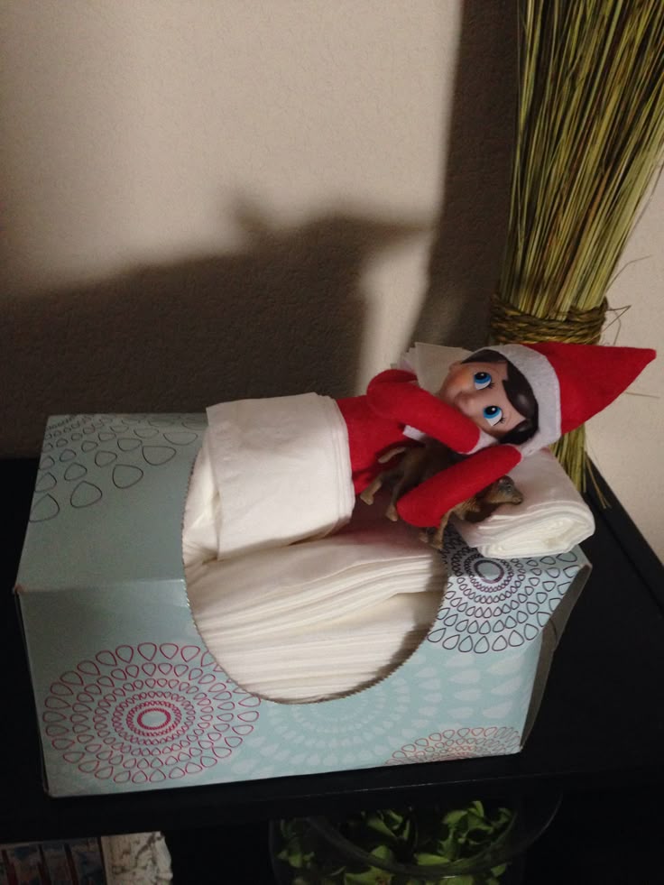 Tuck your elf snugly inside a tissue box with a few tissues pulled up like a cozy blanket.