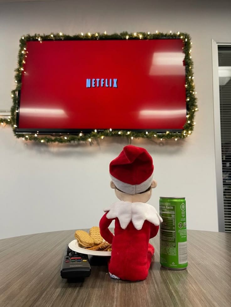Set up the elf with a phone or tablet showing a Christmas movie and scatter a few popcorn kernels or candy around.