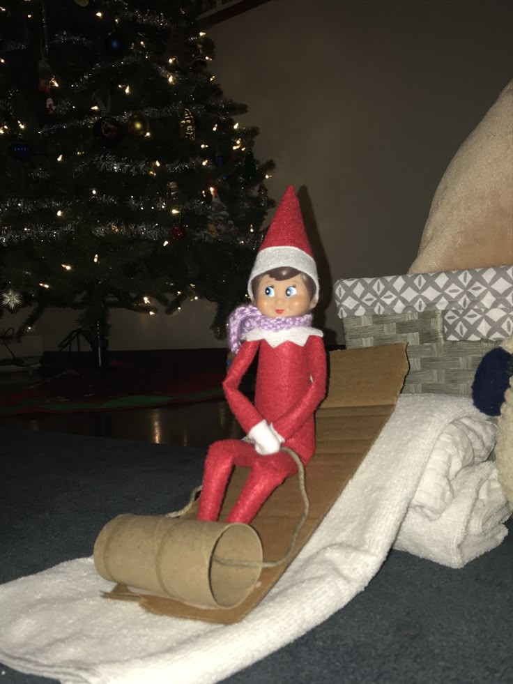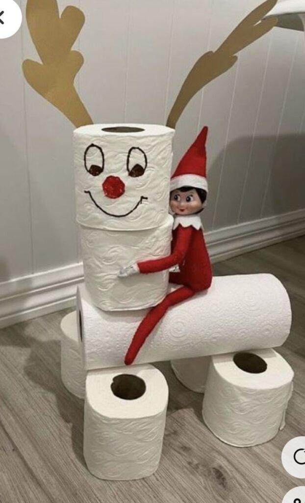 Stack a few toilet paper rolls to make a reindeer body (you can tape on paper antlers or use pipe cleaners) and place your elf sitting on top like they’re going for a joyride.