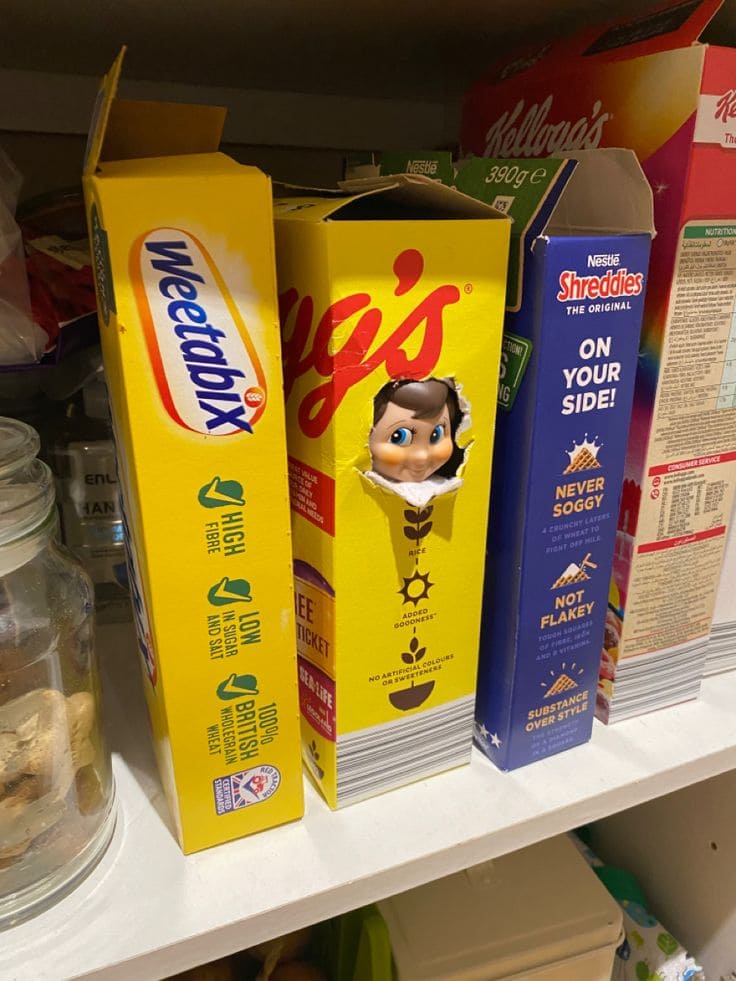 Cut a little window in a cereal box and have your elf peeking out like they’re living their best life in there.