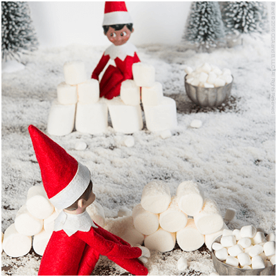 Scatter mini marshmallows around a few small toys and position the elf like they’re mid-throw.