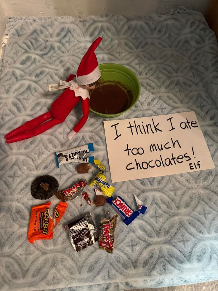 Scatter a few candy wrappers around your elf and drizzle some melted chocolate or brown sprinkles in front of them like they’ve had way too much sugar.