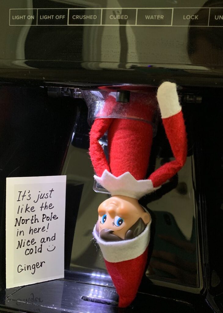 Place your elf in the ice dispenser area of your fridge, with their little face or hands peeking out like they got trapped while exploring.