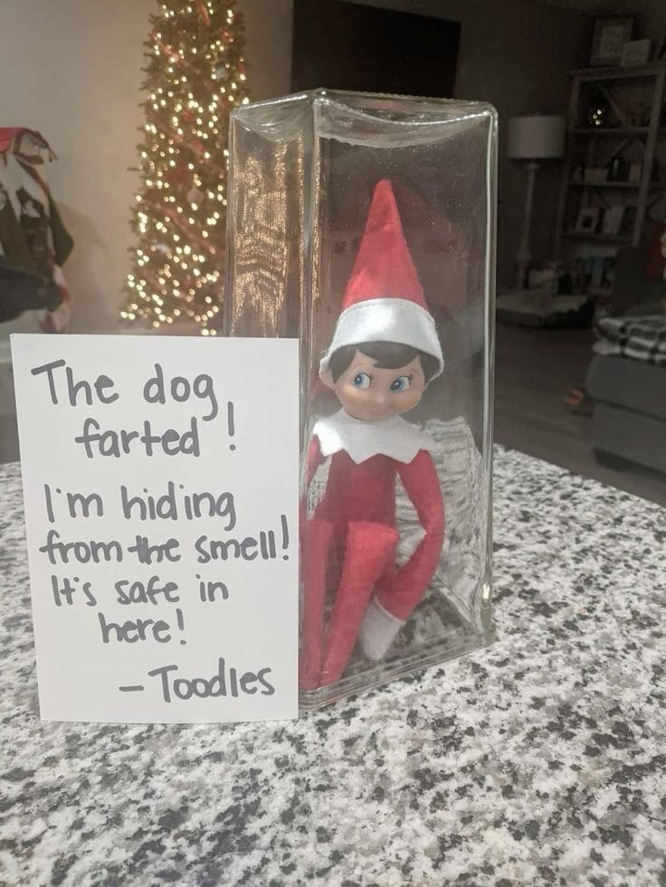 Place your elf behind a pillow, behind a plant, or even covering their nose with a tissue, and write a tiny sign that says, “Your dog did it again.”