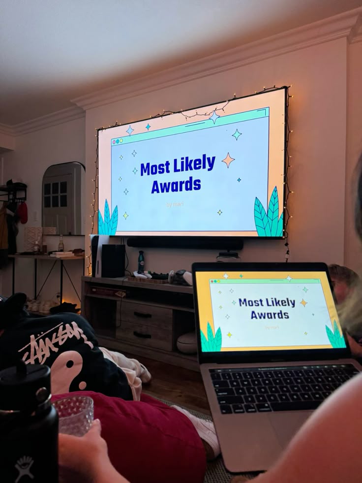 Everyone prepares a short, funny PowerPoint on a random topic, celebrity crushes, worst dates, or favorite comfort foods.