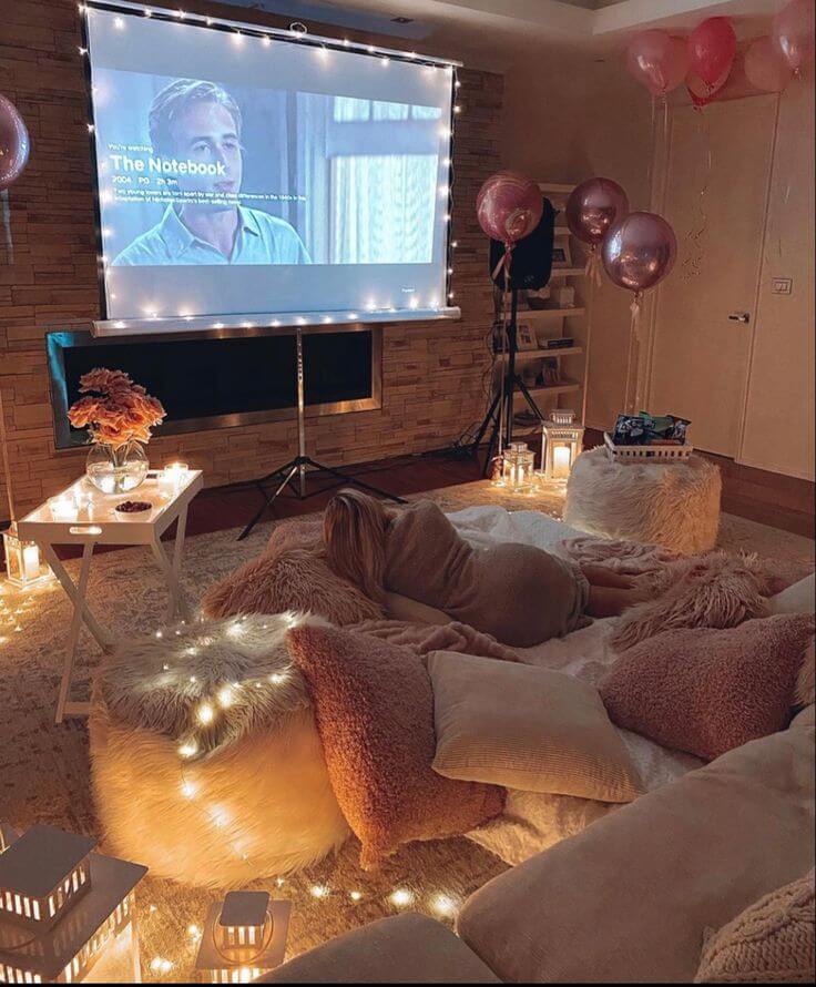 Spice it up with heart-shaped cookies, chocolate-drizzled popcorn, and some fun drinks. Make it comfy with blankets, cushions, and twinkling lights.