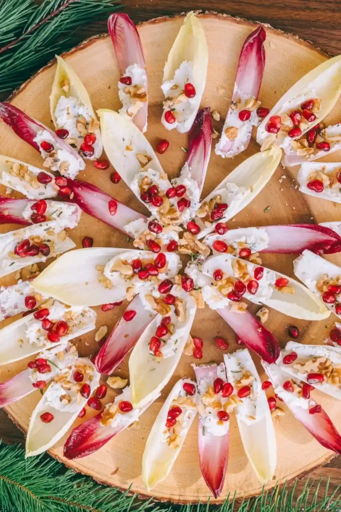 Simply separate endive leaves, spread a small amount of softened goat cheese in the base, and top with a sprinkle of pomegranate arils and a single mint leaf.