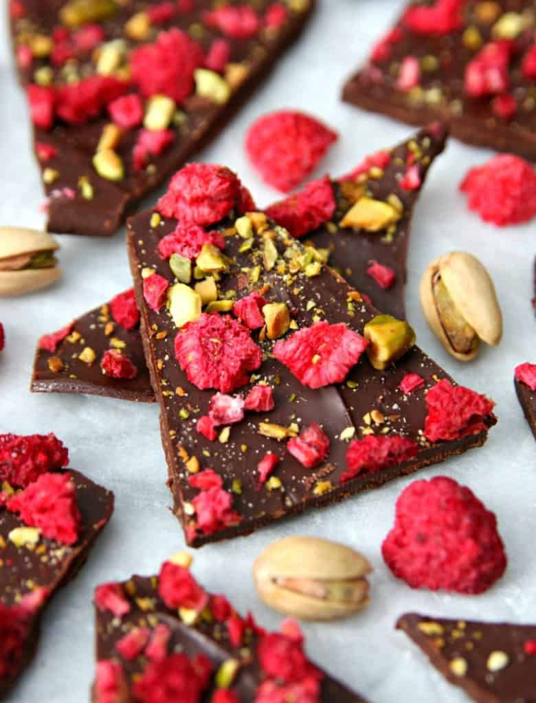 Dark chocolate bark swirled with freeze-dried raspberries and a sprinkle of sea salt is easy to make and easy to break apart.