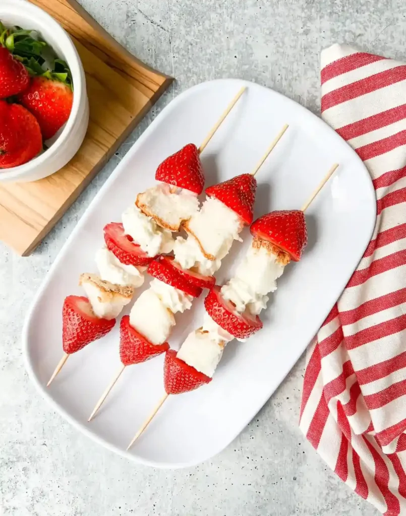 Pound cake cubes, strawberries, and whipped cream threaded onto skewers feel playful and easy to eat.