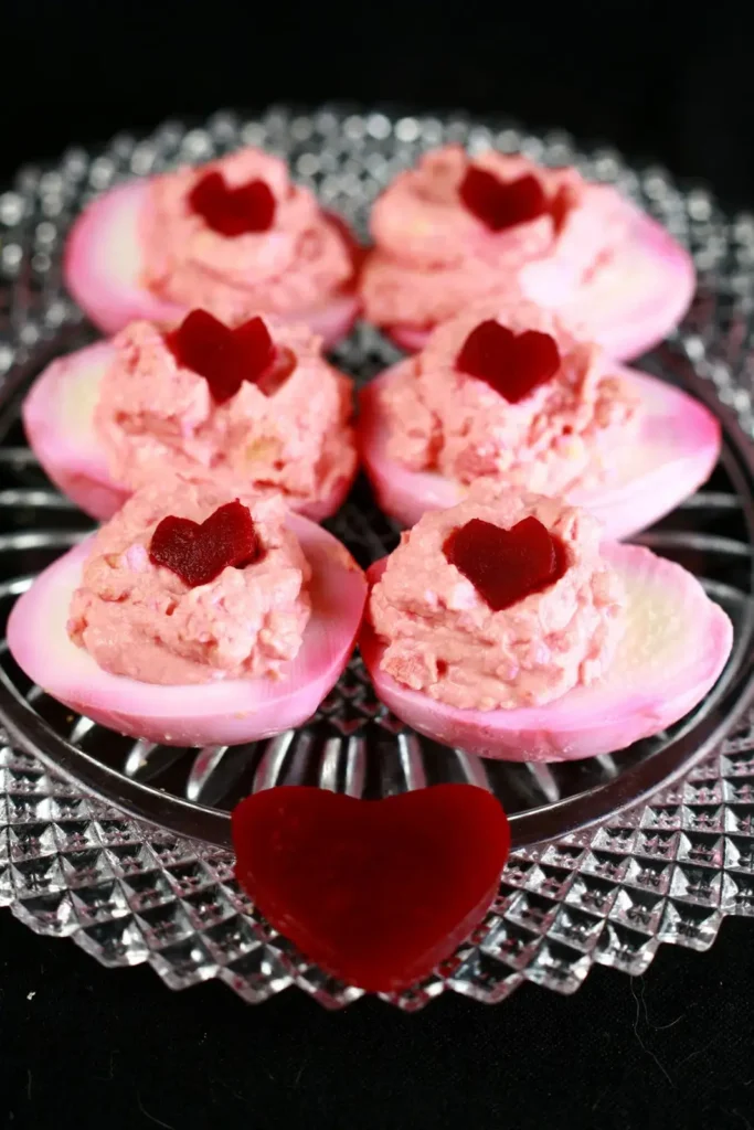 Classic deviled eggs stay familiar, even when the whites are lightly tinted with beet juice.