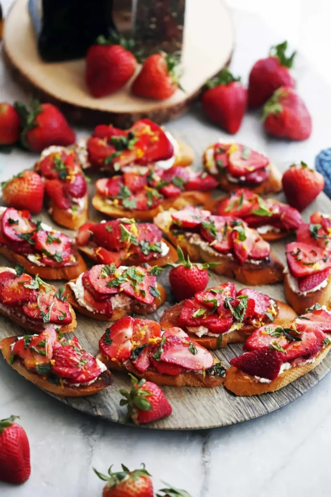 Whipped ricotta spread over toasted baguette slices with sliced strawberries keeps the balance right, creamy, fresh, and not overly sweet.
