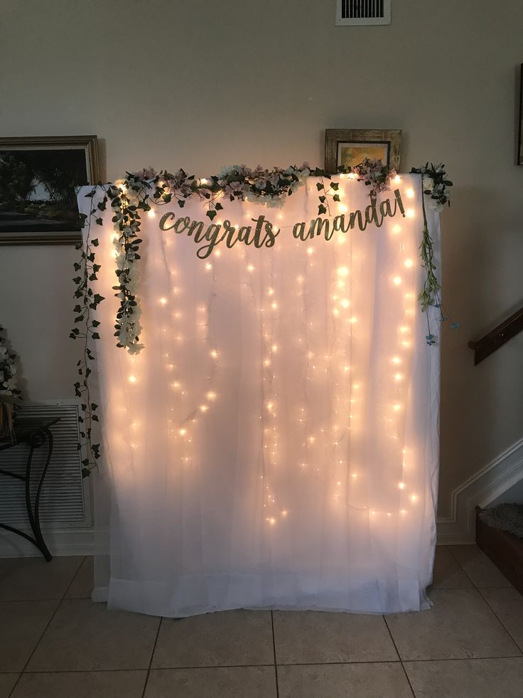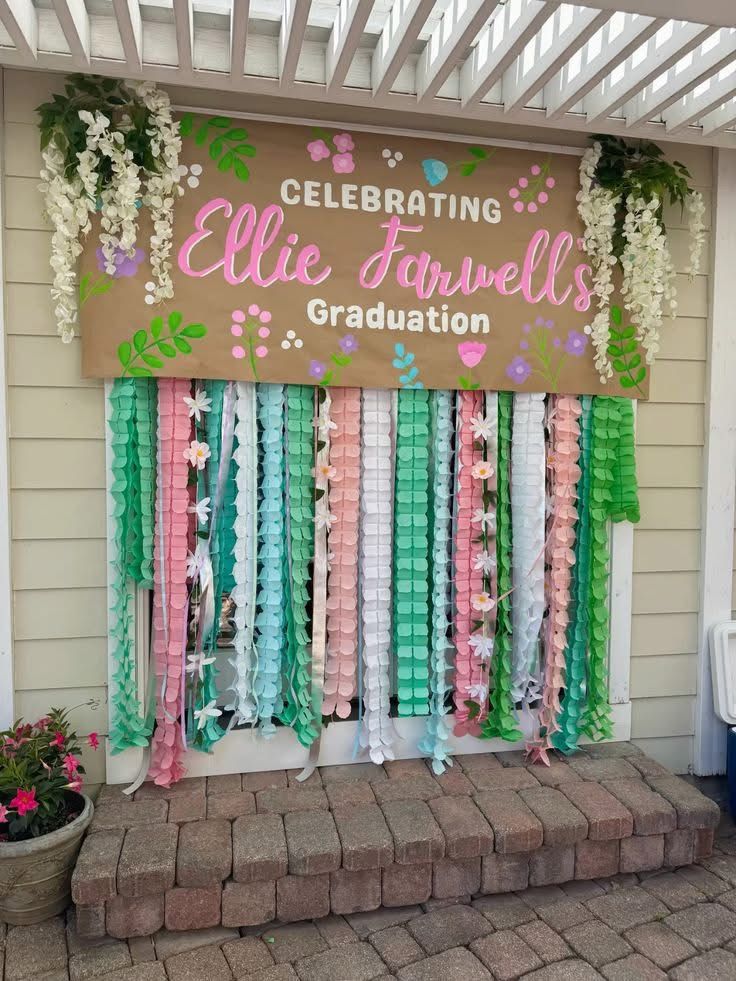 Hang a paper banner that spells out something like “Congrats Grad” or “Class of 2026”, then build the backdrop around it with a plain wall, a curtain, or even a sheet as the base.