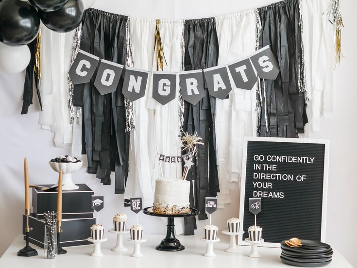 Don’t forget to order your graduation cake! It’s a key part of your party, serving as the star of your dessert table. Customize it with your college or party colors, and add a “Congrats” message along with your name on a sash displayed on the cake stand.