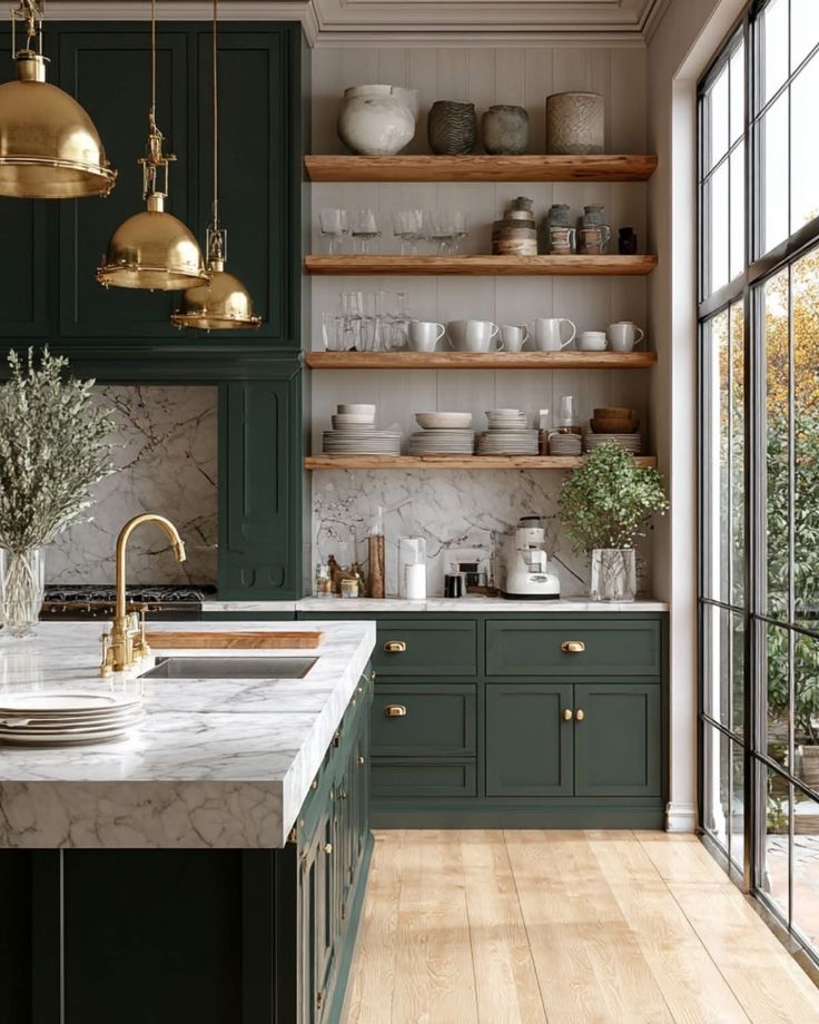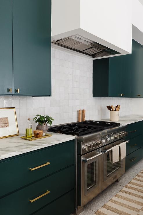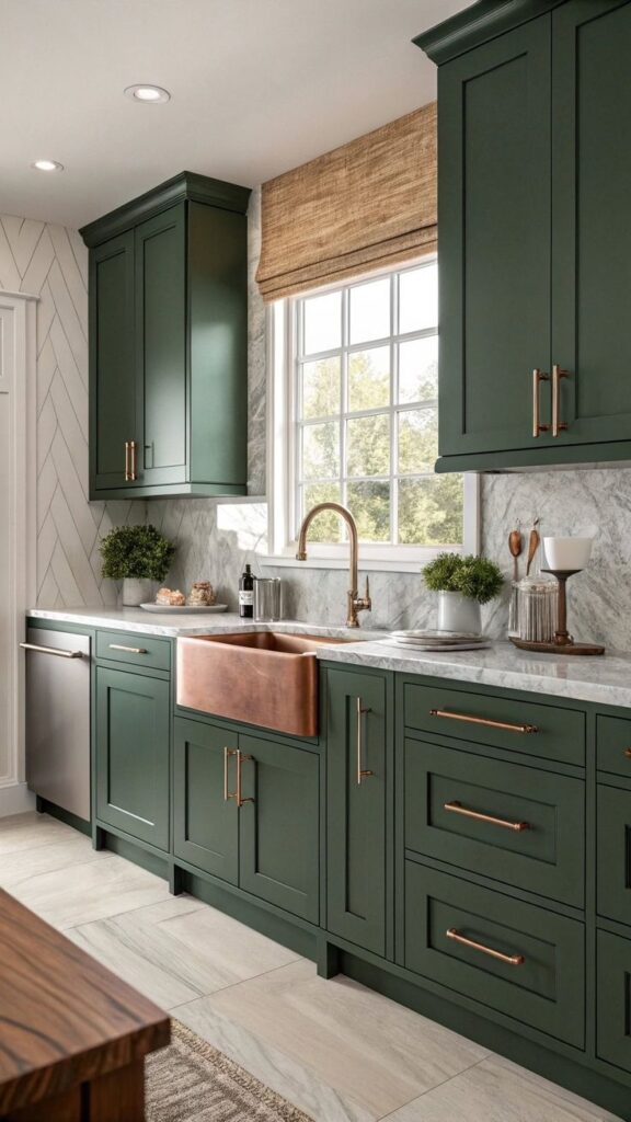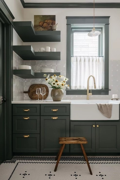 Deep forest green adds weight and contrast, which makes everything else, your backsplash, your counters, even your decor, stand out more.