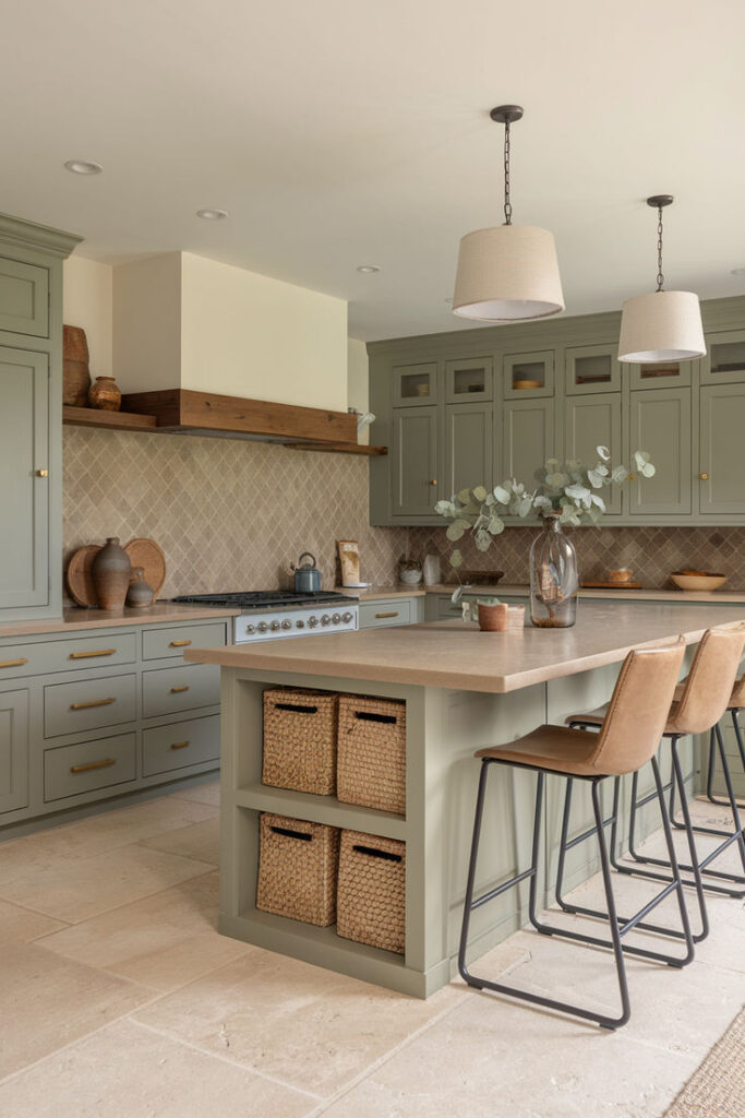 3. Olive Green Cabinets with Warm Wood Accents