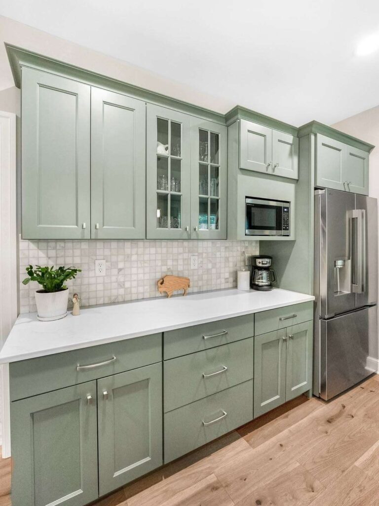 Shaker cabinets already have a structure that holds up over time, so adding green is more of an update than a risk.