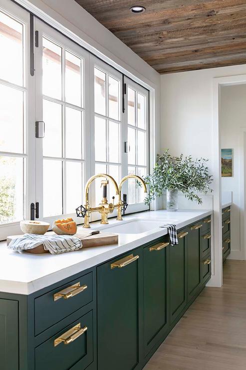 Brass fixtures bring warmth into the space, which balances out the cooler tones in green cabinets.
