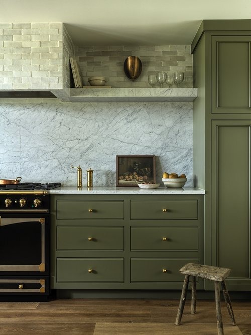 7. Green Cabinets with Marble Backsplash