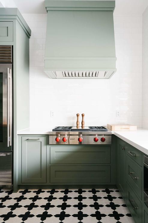 21. Green Cabinets with Patterned Tile Flooring