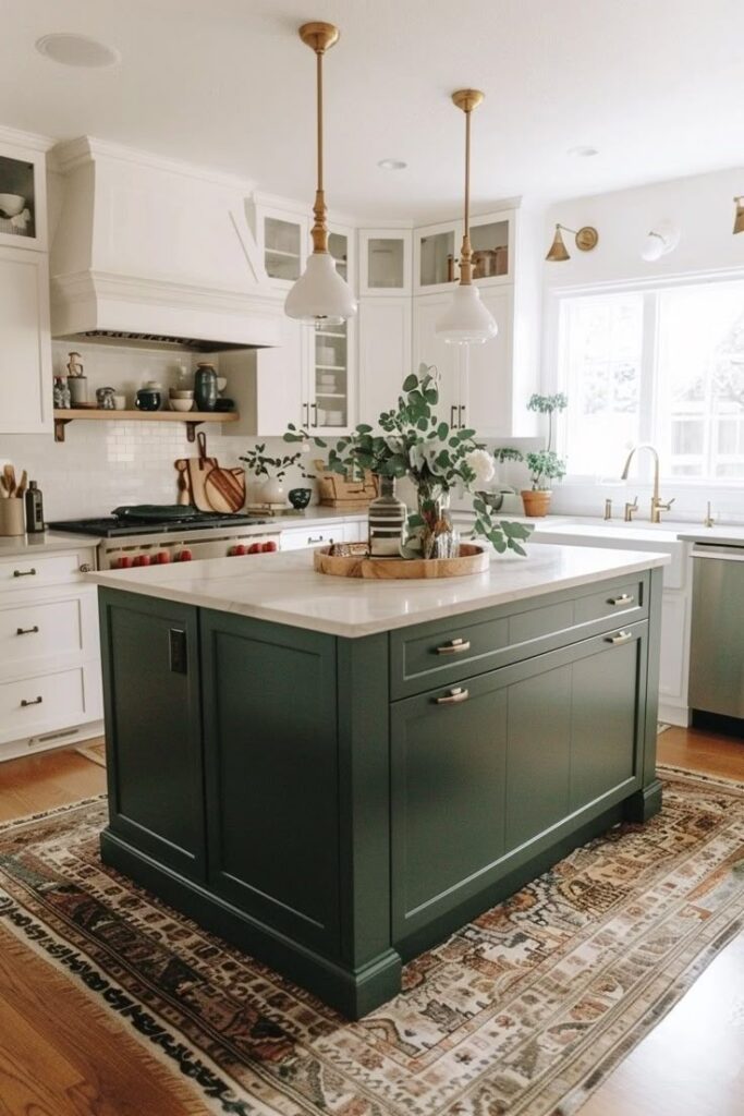 A dark green island gives you that contrast and depth without committing every cabinet to color.