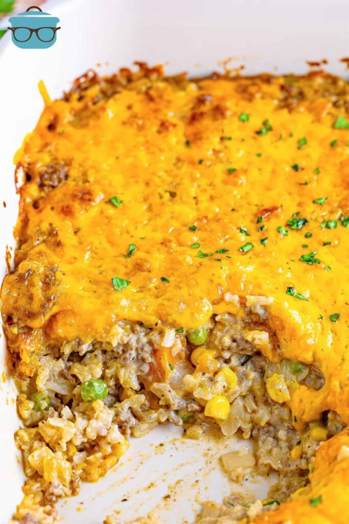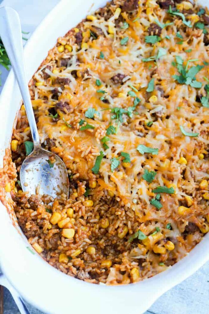 Spiced rice, juicy ground beef, and tangy tomatoes bake together for a casserole with a punch of flavor.