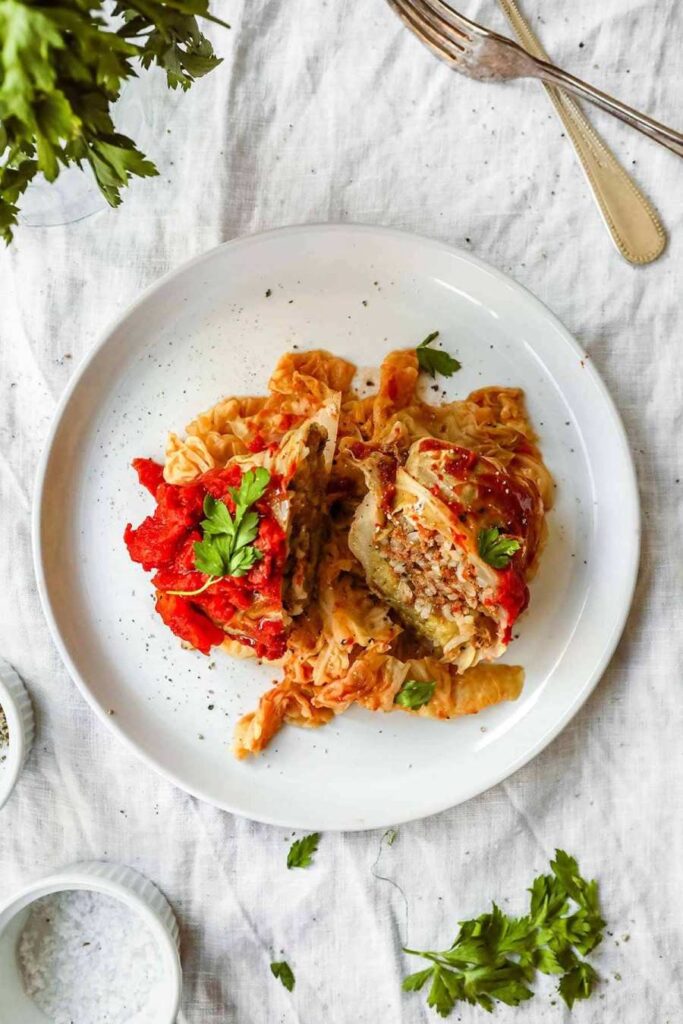 Cabbage leaves wrapped around beef and rice, then baked in tangy tomato sauce.