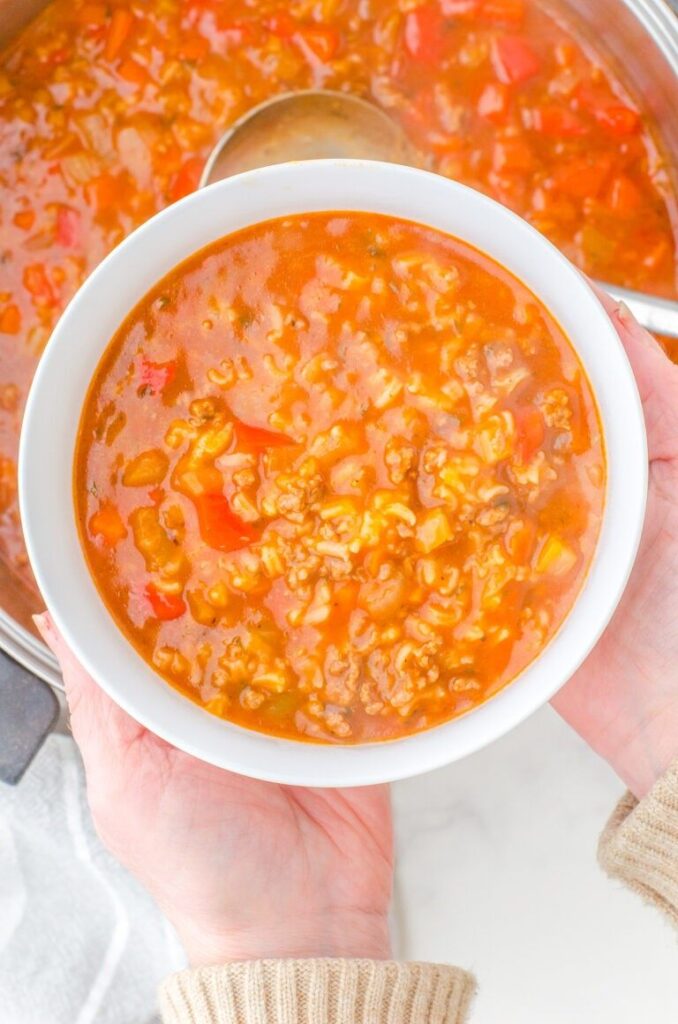 This cozy soup combines ground beef, vegetables, and rice for a nourishing bowl of comfort.