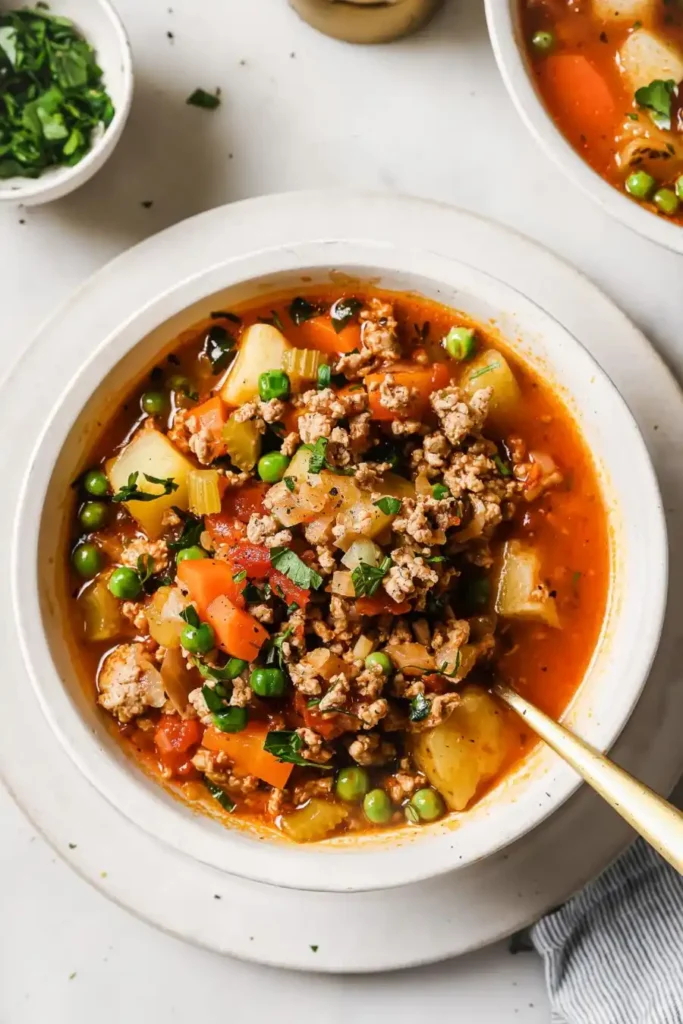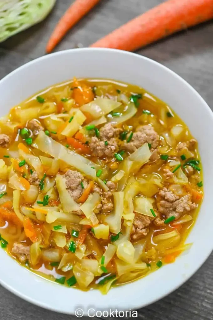 This light soup blends cabbage, carrots, and turkey in a tomato-based broth for a cozy, low-carb option.