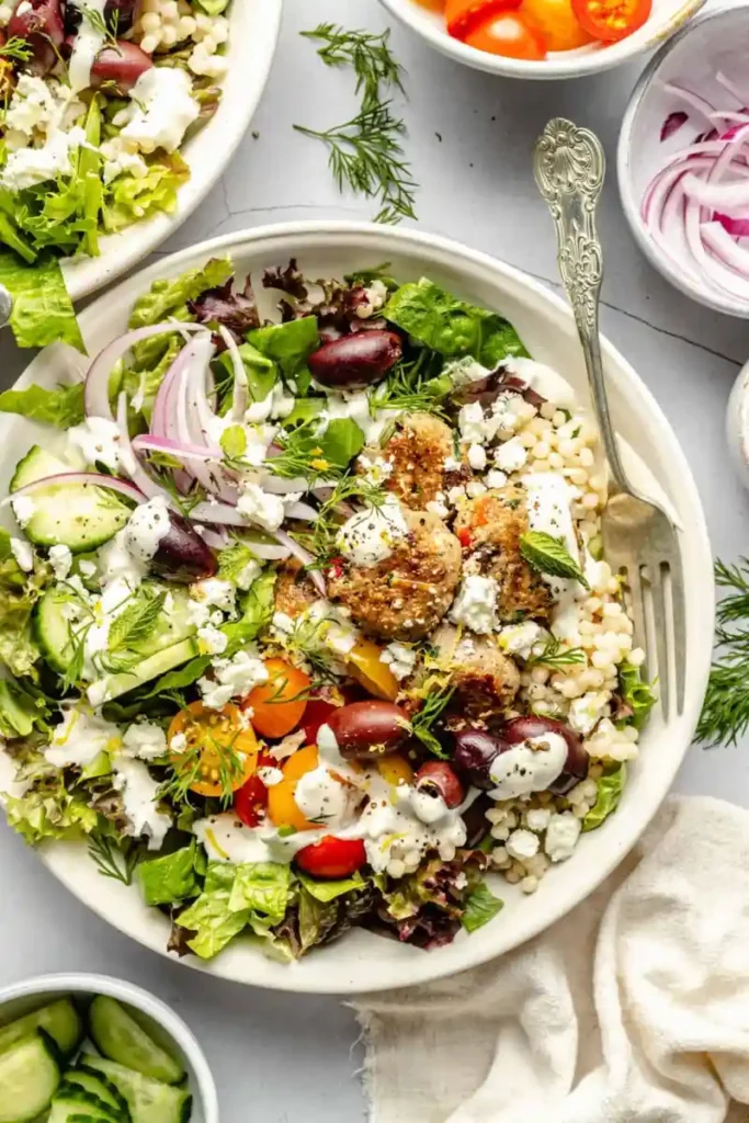 The lemony tzatziki drizzle ties everything together with bright Mediterranean flavor.