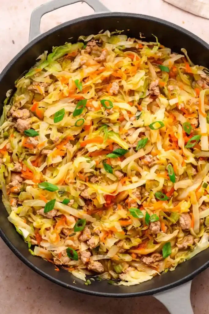 This stir-fry mixes ground turkey with sautéed cabbage, garlic, and soy sauce for a quick, low-carb meal.