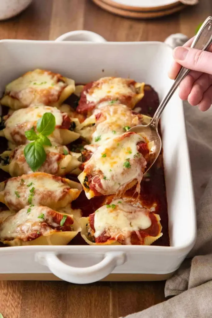Jumbo pasta shells filled with a creamy ricotta and turkey mixture, baked under marinara until golden.