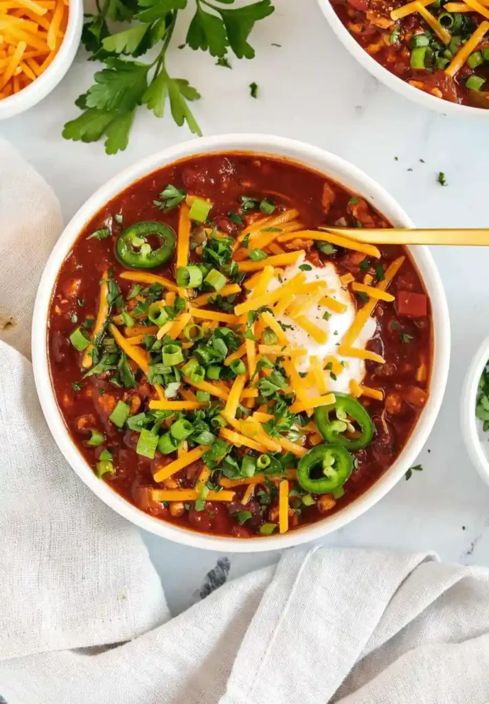 A hearty pot of chili made with lean turkey, beans, and smoky spices.