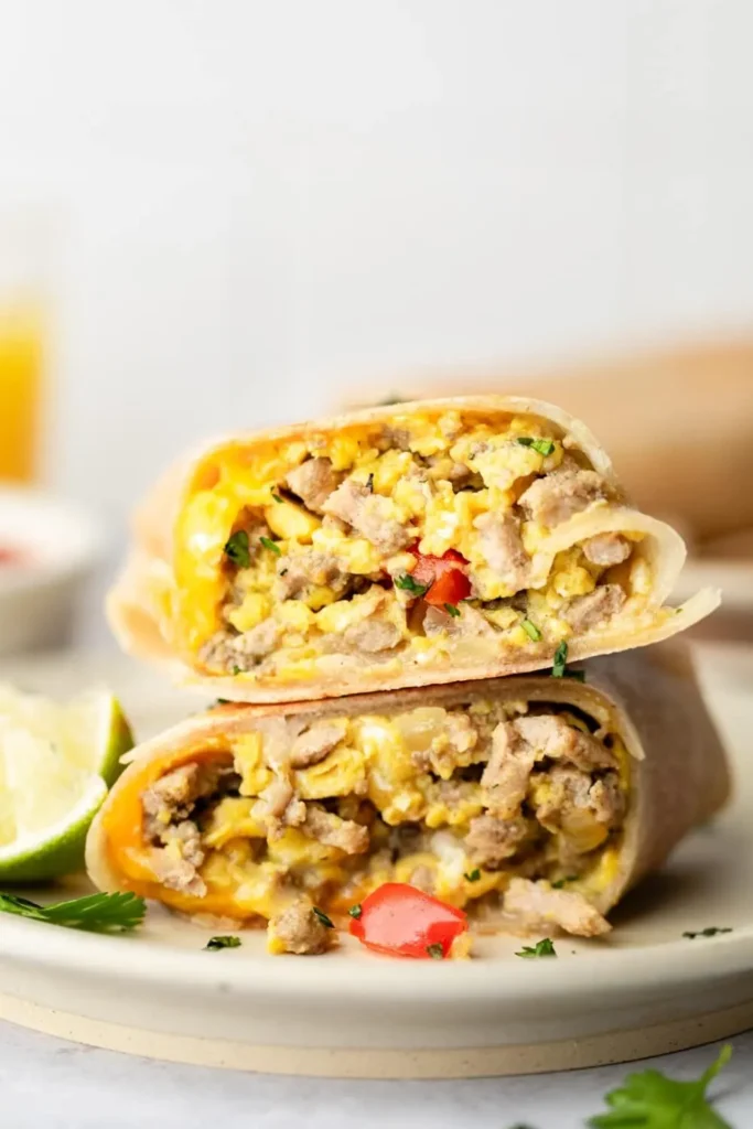 These burritos are loaded with scrambled eggs, turkey, cheese, and salsa for a filling start to your day.