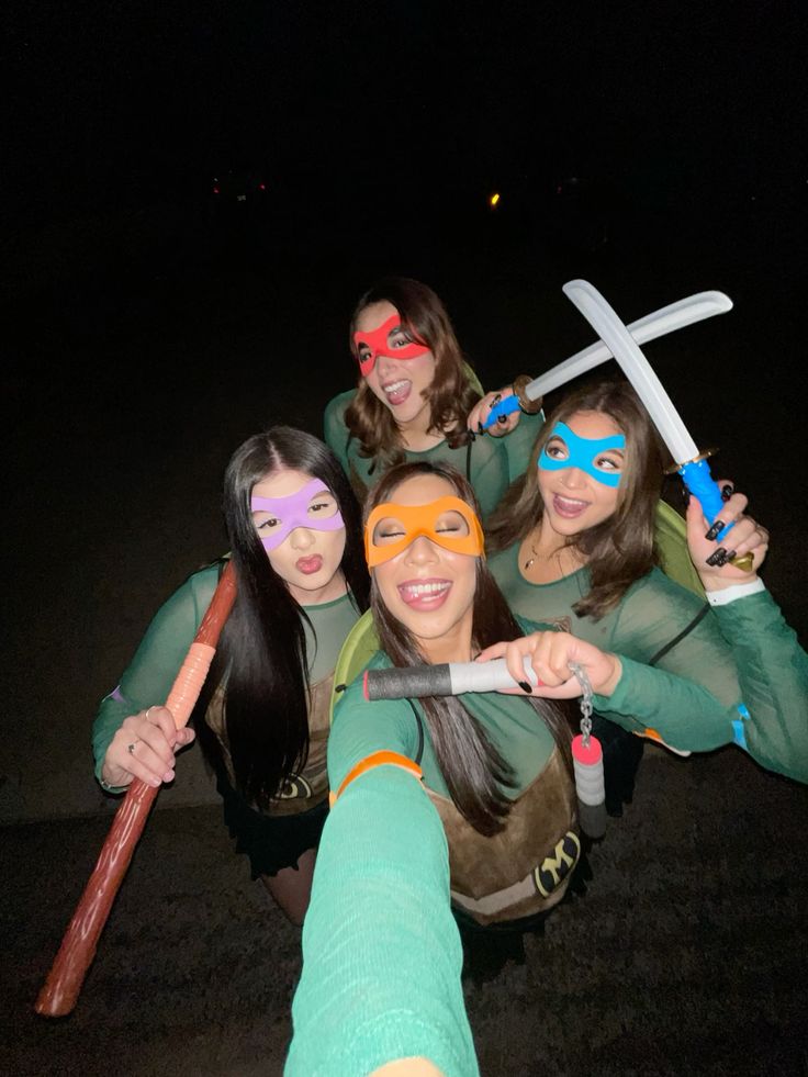 With green shirts, colored masks, and toy weapons, this makes one of the best last-minute group Halloween costumes that still looks awesome.