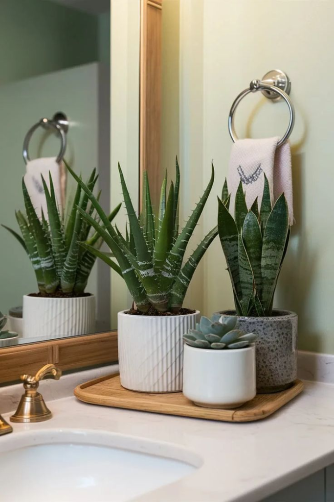 If your guest bath has natural light, go for a low-maintenance plant like a snake plant or pothos.