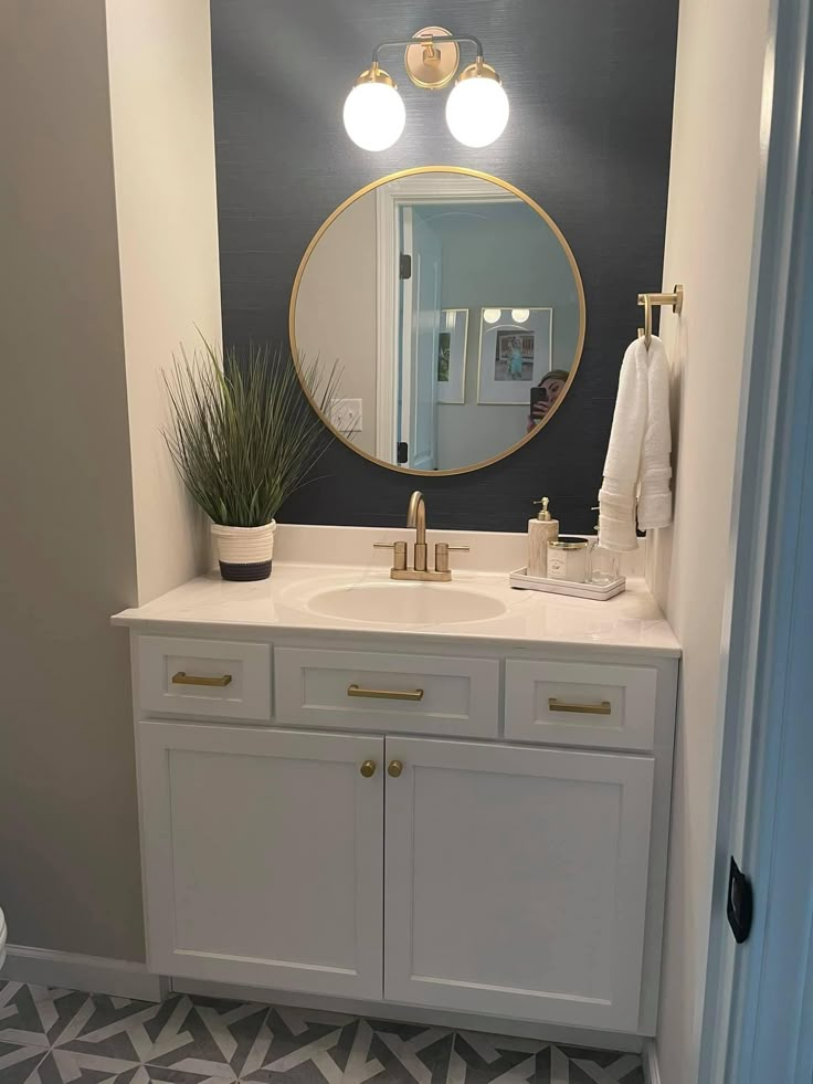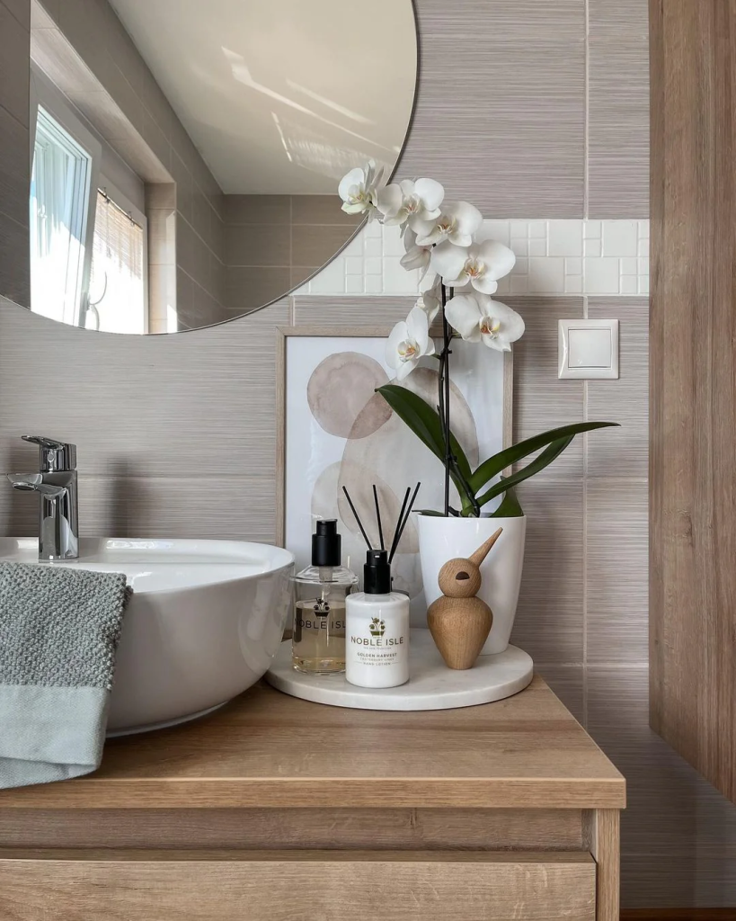 A round, arched, or wood-framed mirror immediately makes your bathroom feel custom.