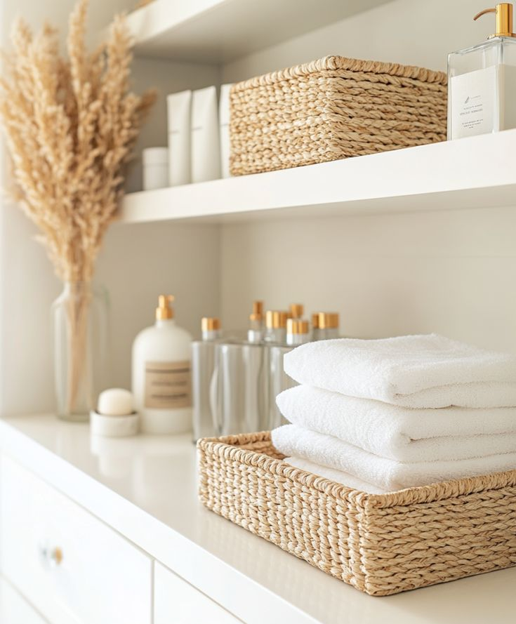 Clutter is the enemy of a cozy guest bathroom. Baskets keep everything organized while still looking stylish.