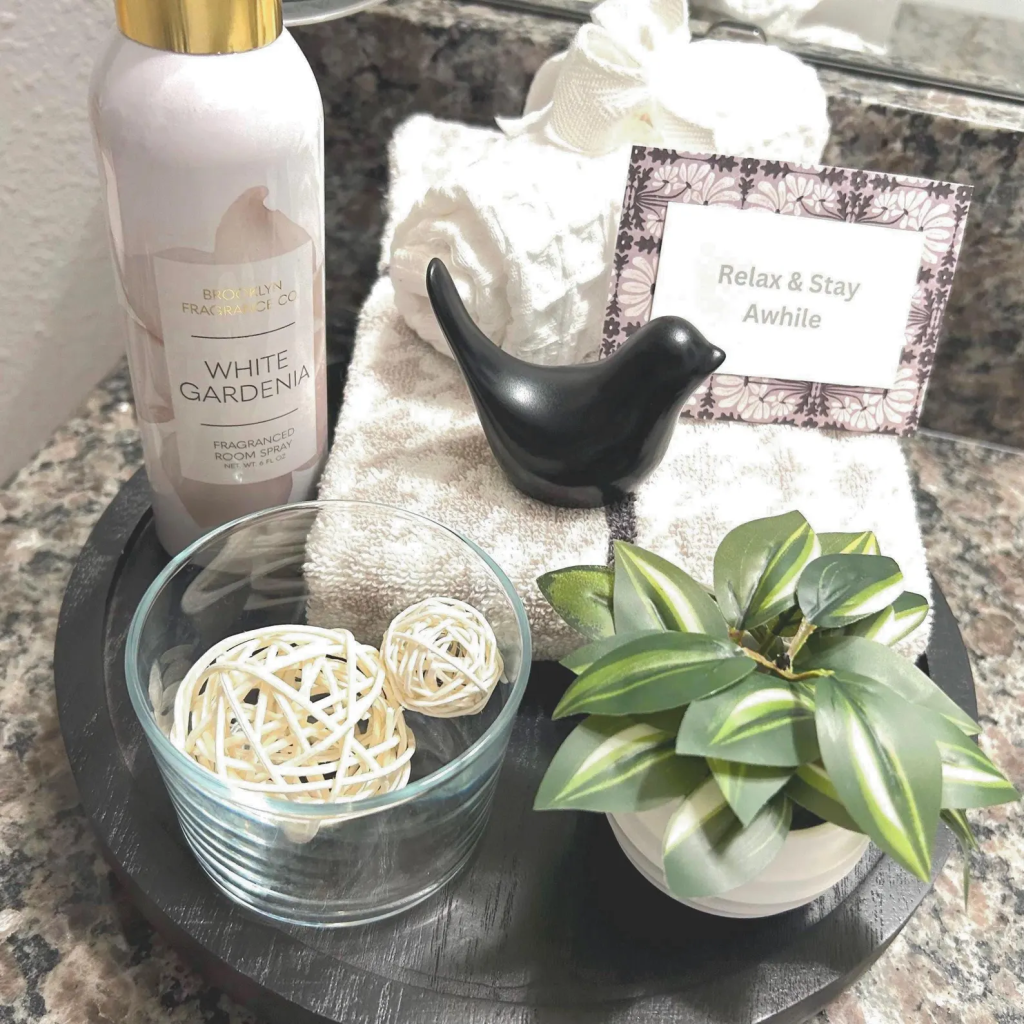 Keep a chic linen or citrus-scented room spray on display so guests can use it if they want. It’s a thoughtful little detail that goes a long way.