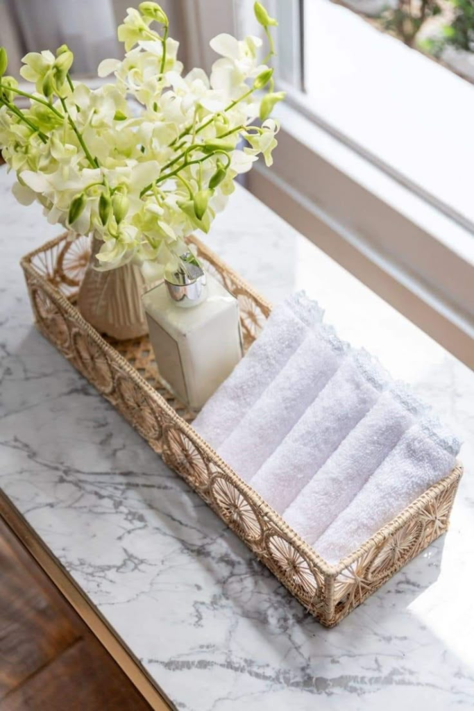 Invest in a soft, hotel-quality set (nothing scratchy!) and either fold them neatly on a rack or roll them into a basket for easy access.