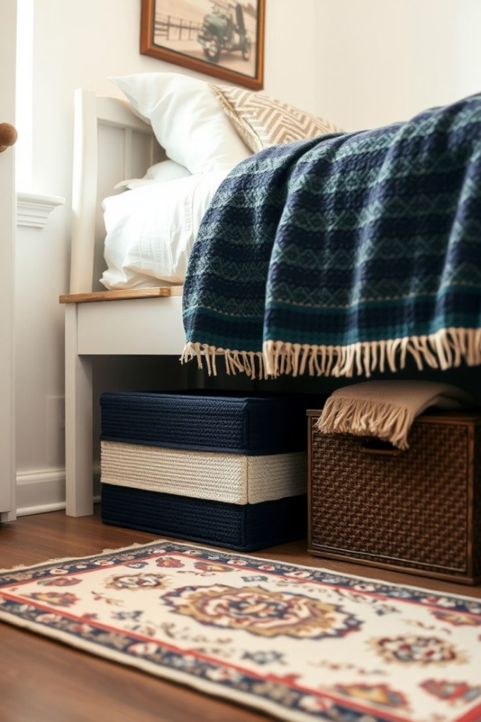 If the room is small, under-bed baskets are perfect for storing extra blankets, pillows, or even guest slippers.