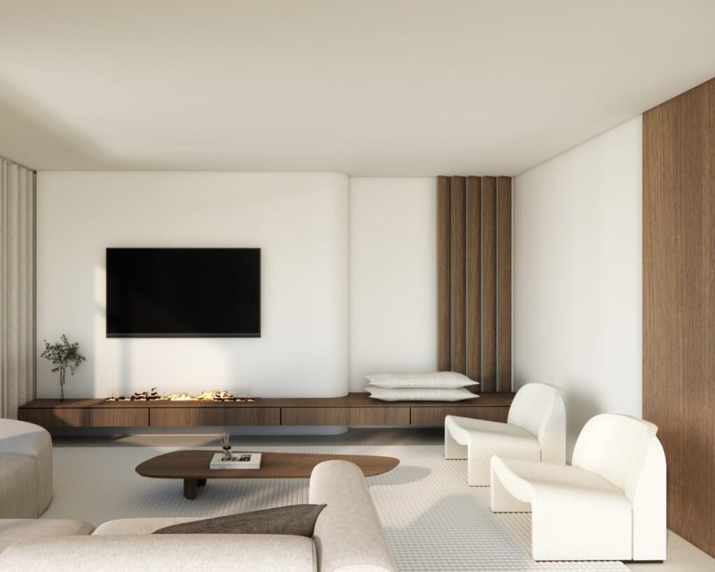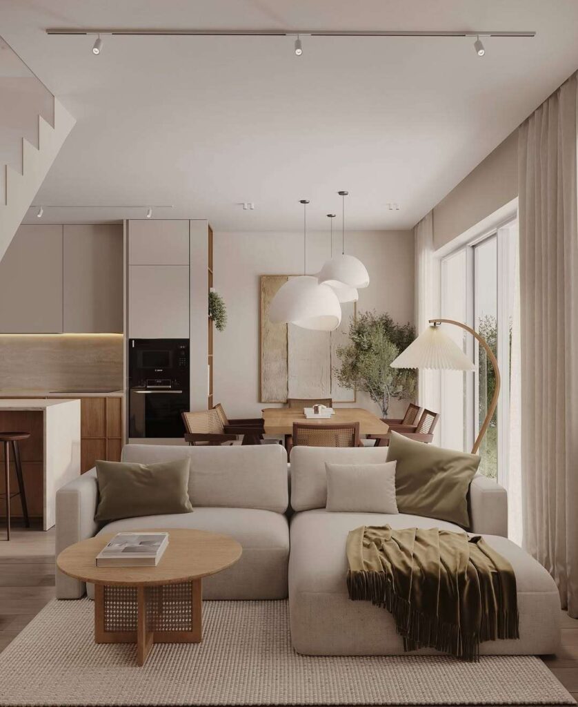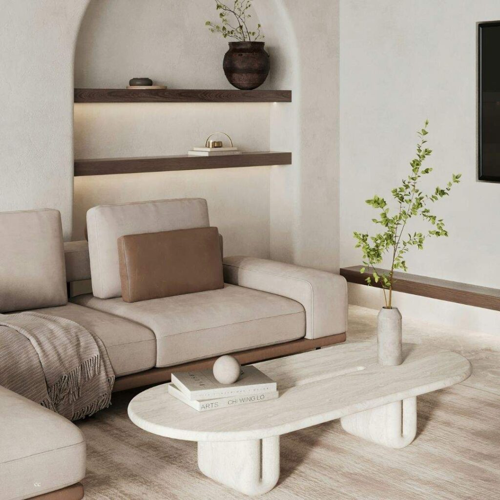 Rounded coffee tables, curved armchairs, or softly shaped cushions add comfort and approachability.