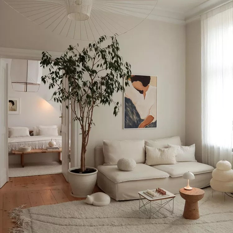 Clutter is the fastest way to undo a Japandi living room.