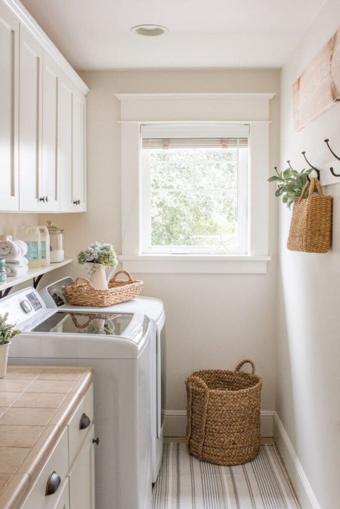 Opt for light-colored curtains or blinds that let sunlight in, making your laundry space bright and pleasant.
