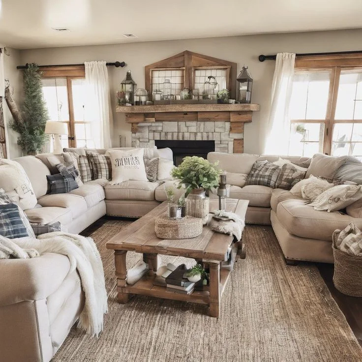 No farmhouse living room is complete without throw pillows, as they add comfort and style.