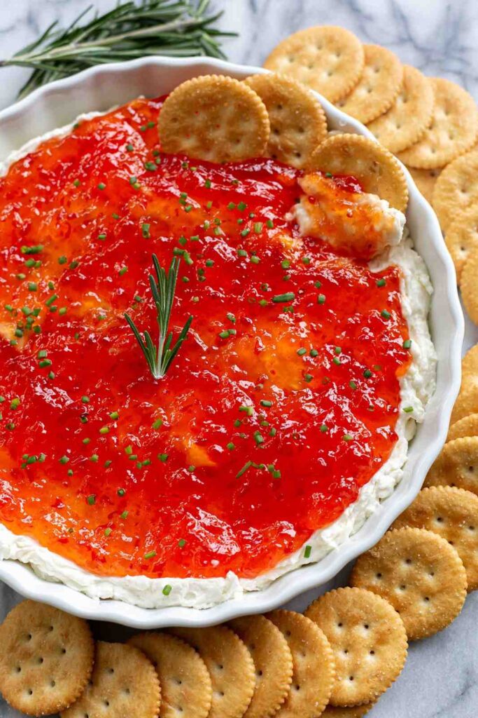 The pepper jelly over cream cheese creates this sweet-spicy spread that pairs perfectly with crackers.